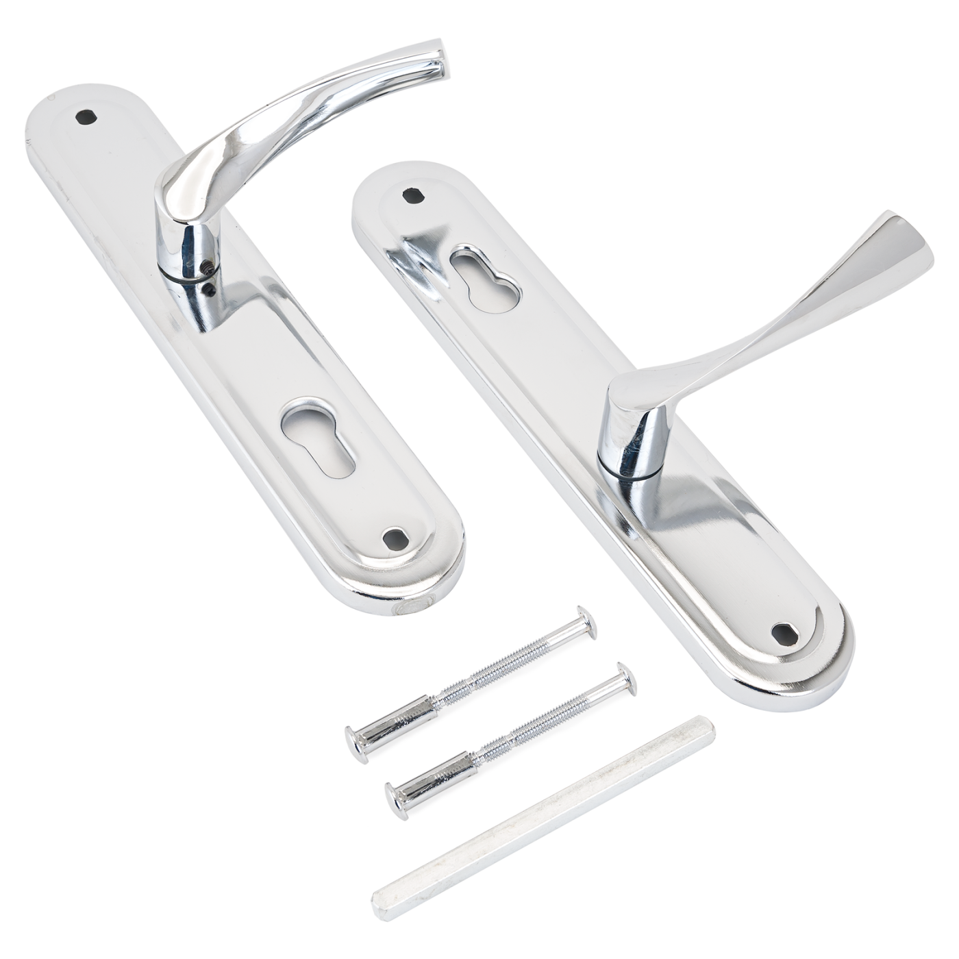 Ручка на планке под замок и цилиндровый механизм. Материал - алюминиевый сплав, гальваническое покрытие. Межосевое расстояние - 85 мм, размеры планки - 45 х 235 мм, длина ручки - 120 мм. В комплект входят винтовые стяжки и квадратный штырь (8х8 мм) 100 мм.