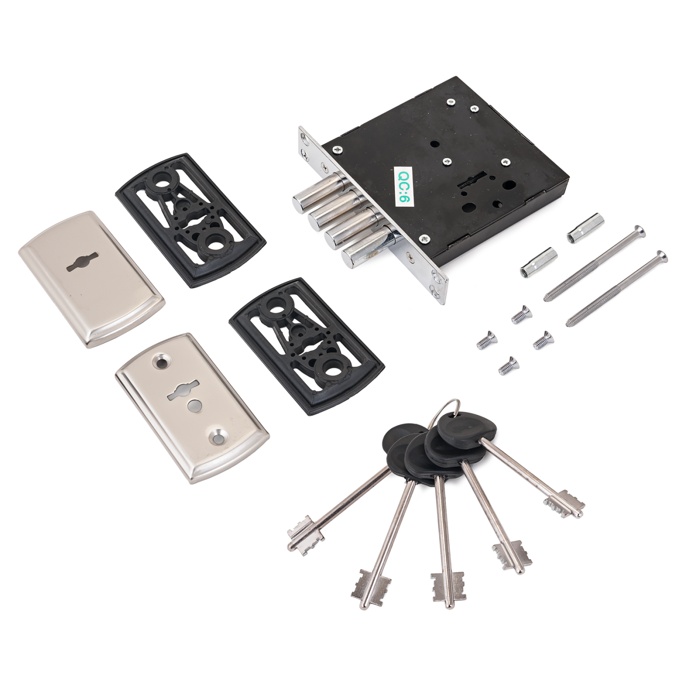 Четыре цилиндрических стальных хромированных ригеля, диаметр 12мм. Вылет ригелей 30мм. Стальной корпус. Удаление ключевого отверстия 60мм. Цвет торцевой планки - хром, ширина 24мм. Комплектуется накладками на механизм, 5ю ключами.