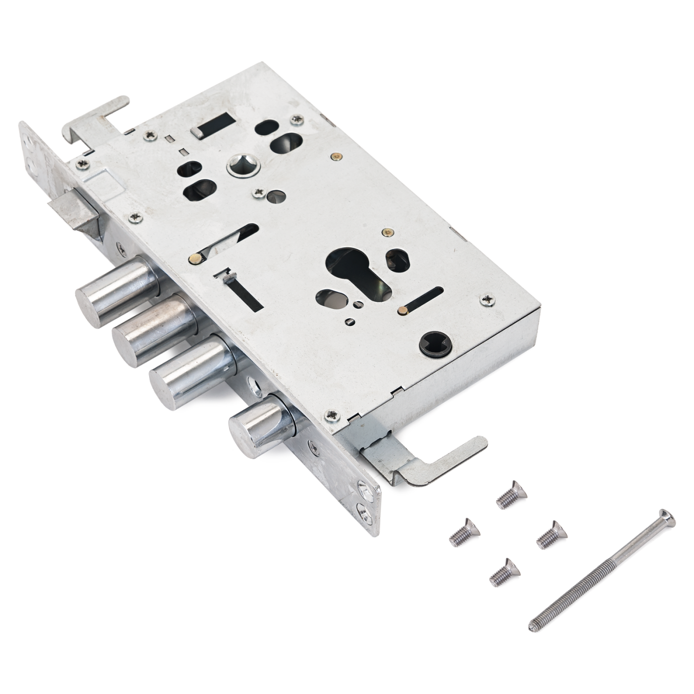 Три цилиндрических стальных ригеля, диаметр 18мм. Вылет ригелей 30мм. 3 точки запирания. Корпус замка - сталь, толщиной 1,1мм. Удаление ключевого отверстия 60мм. Межосевое расстояние 68мм. Расстояние от центра механизма секрета до задвижки 52мм. Цвет торцевой планки - хром, ширина 30мм.