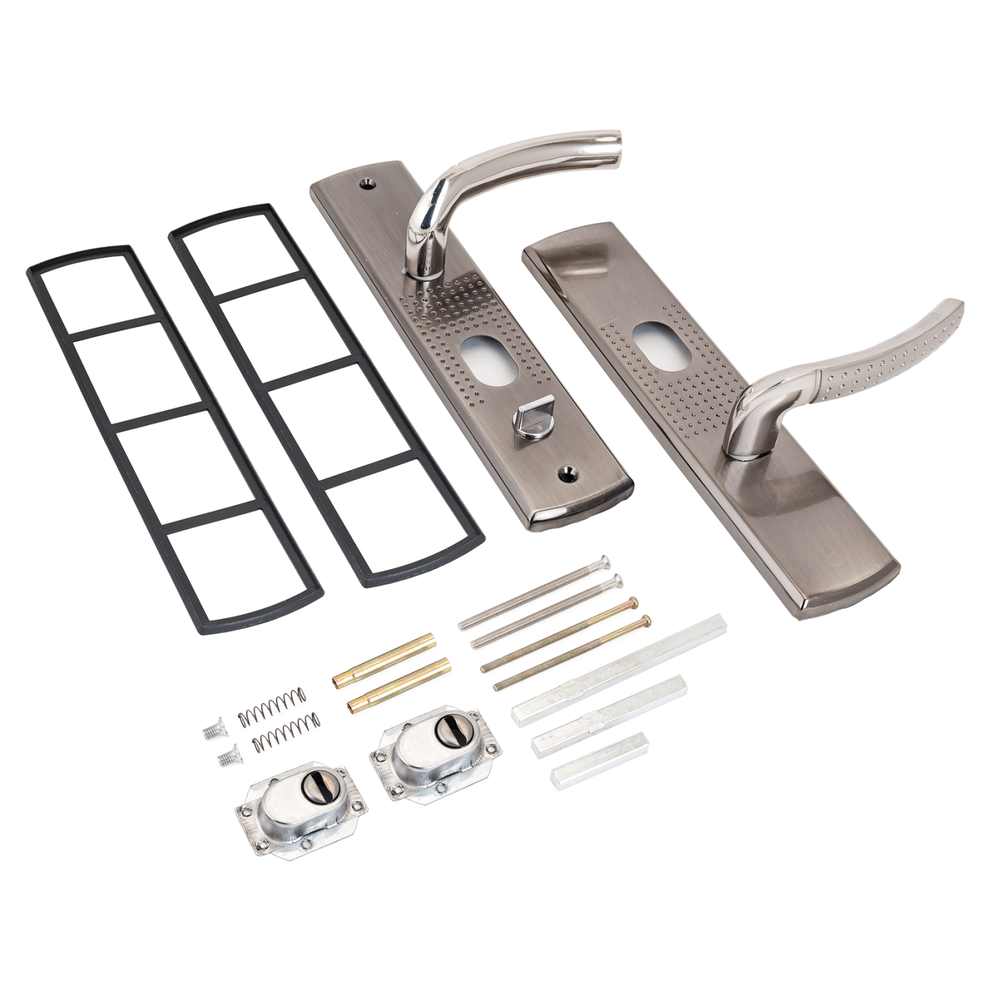 Подходят для замков автоматического и не автоматического закрывания. Материал планки - сталь, толщиной 1,1мм, ручки - алюминиевый сплав. Гальваническое покрытие. Межосевое расстояние - 68 мм, размеры планки - 70х275 мм, длина/высота ручки - 120/17 мм соответственно. Цвет ручек и планки - никель. В комплект входят две ручки, винтовые стяжки, пластиковые прокладки и квадратный штырь (8х8 мм) 110 мм,