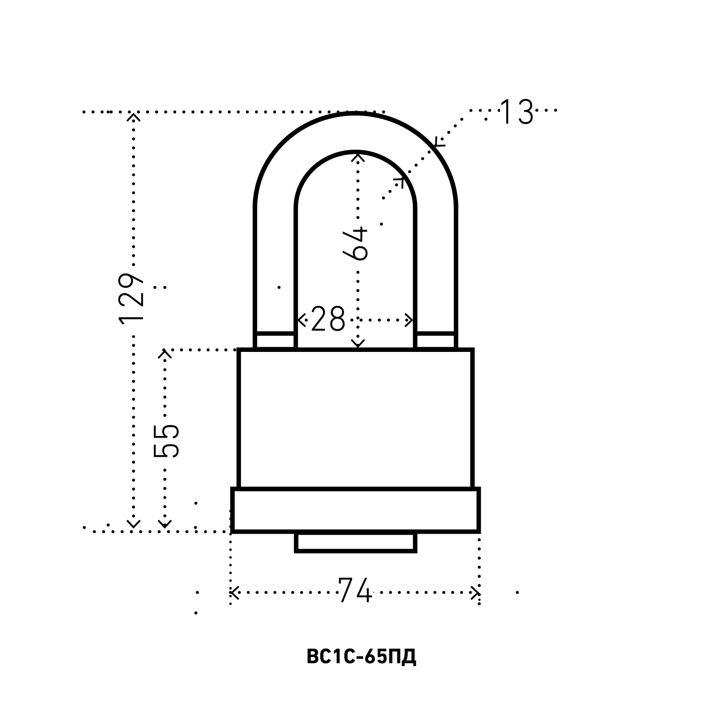 Ширина основания корпуса - 74мм, диаметр дужки 13,5мм.