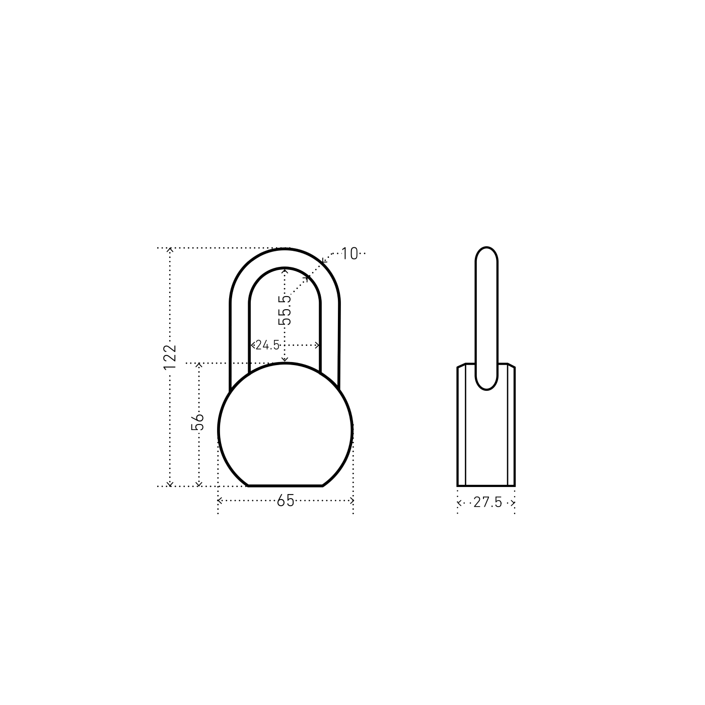 Ширина основания корпуса - 65мм, диаметр дужки 10мм.