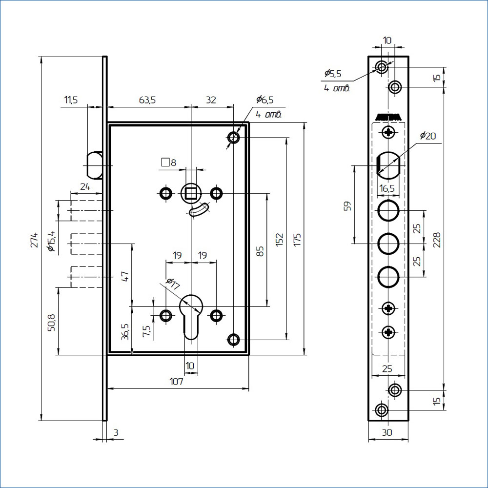Балашиха ЗВ7 718.0.0 м/о 85 мм, б/о, без ц/м, 3 ригелей d15,4 мм Замок врезной тяж