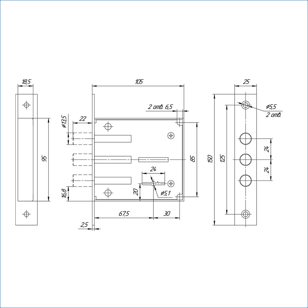Замок имеет одно направление запирания. Три стальных ригеля круглой формы надежно фиксируют дверь в закрытом положении. Вылет ригелей составляет 22 мм.