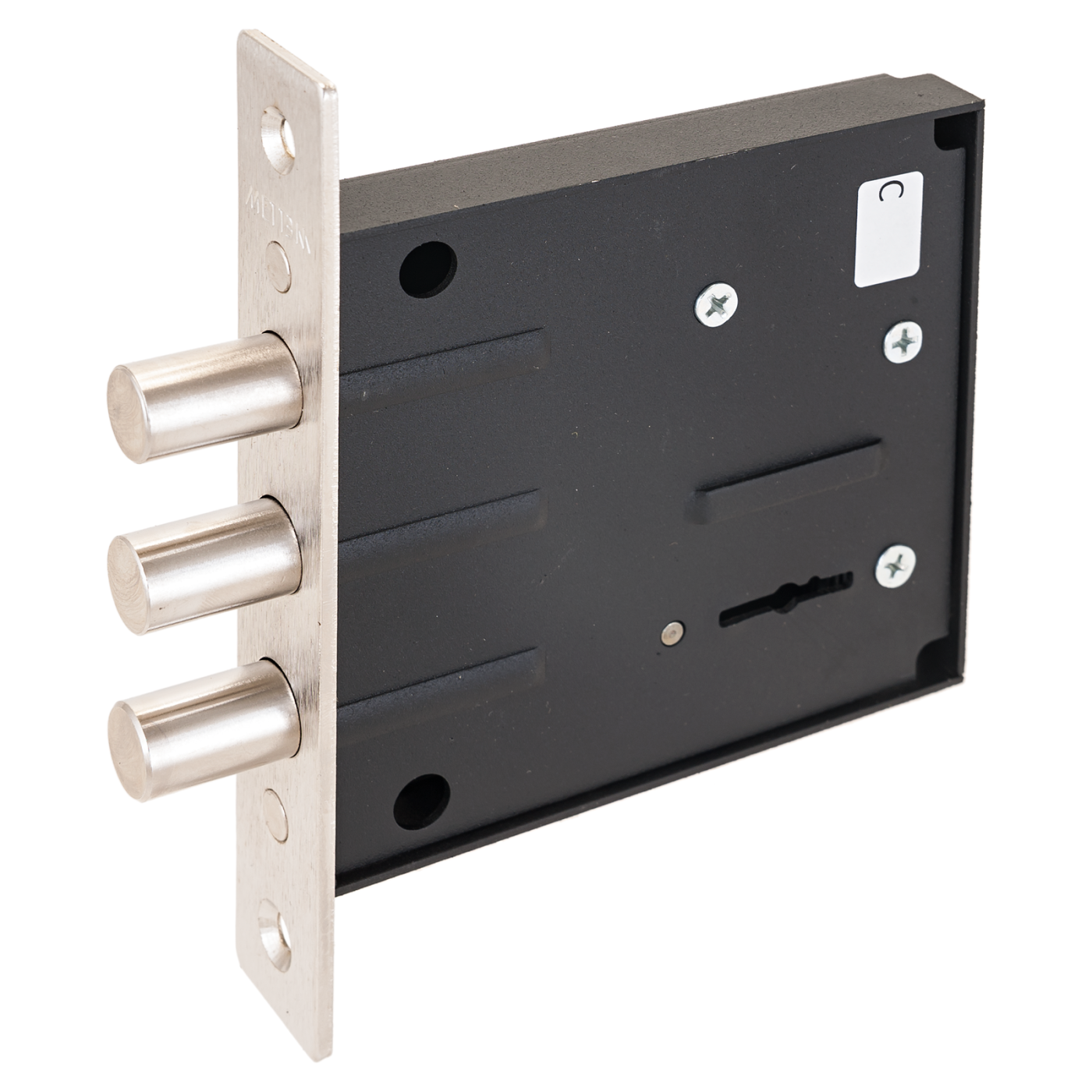 ЗВ8 842.0.0 имеет одно направление запирания — тремя стальными ригелями диаметром 14 мм, которые выдвигаются из корпуса замка на 22 мм. Замок запирает дверь на два полных полуоборота.