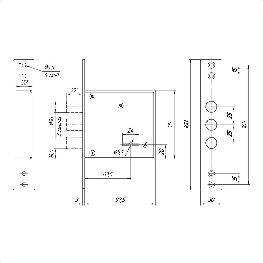 ЗВ8 882.0.0 имеет одно направление запирания — тремя стальными ригелями диаметром 16 мм, которые выдвигаются из корпуса замка на 22 мм. Замок запирает дверь на два полных полуоборота.